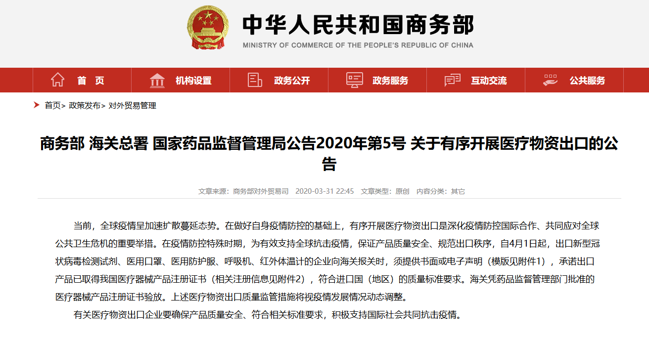 商務(wù)部、海關(guān)總署、藥監(jiān)聯(lián)合發(fā)布2020第5號公告,即日4月1日起執(zhí)行,新規(guī)對于我國出口醫(yī)療防疫物資將有新的管理標(biāo)準(zhǔn)要求。